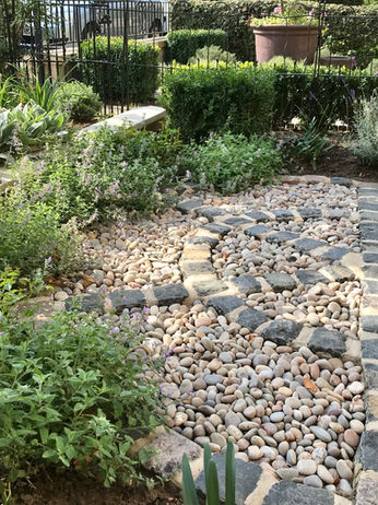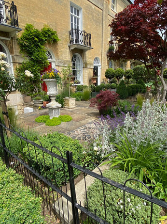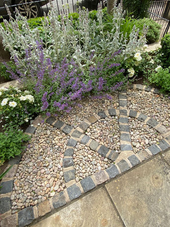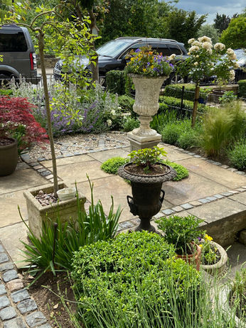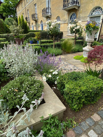 The inspiration for this design came from the beautiful arch details above the front door and the ground floor window, which was reflected in the reclaimed granite setts and pebble detailing within the reclaimed York stone paving. A restrained planting colour palette of blues, whites and yellows mixed in with some grasses helps to soften the hardscaping and the use of box topiary cubes mimic the large, finely cut stone of the house.